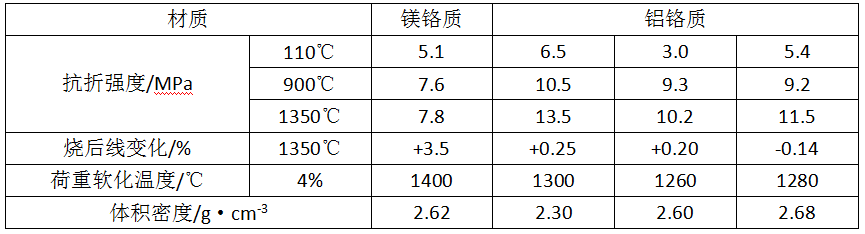 表1-2 鎂鉻和鋁鉻質可塑料的性能