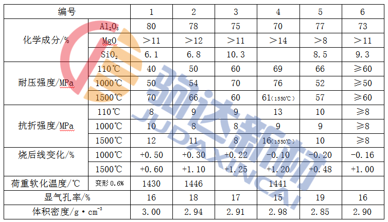 超微粉結合鋁鎂尖晶石質耐火澆注料用的耐火骨料,主要是山西特級礬土熟料,Al2O3與TiO2含量約為90%,臨界粒徑約為25mm,一般采用連續顆粒級配,也有用間斷級配的;結合劑為活性的SiO2超微粉,SiO2大于91%,中直徑D50約為3um,另加聚磷酸鈉等分散劑和快干劑。其性能見表1-1。基質中均加高檔次的鋁鎂尖晶石粉、剛玉粉和α-Al2O3超微粉。表中編號1添加電熔鎂砂粉、剛玉粉和α-Al2O3超微粉。表中編號1添加電熔鎂砂粉,用量約為9%;編號2添加高純鎂砂粉,編號4添加MgO約為94%的燒結鎂砂粉,編號3、編號5和編號6則為中檔鎂砂粉。其細度均不大于0.088mm。