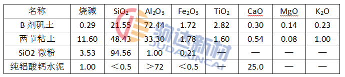 為了提高材料的抗震穩定性,并考慮到加熱爐的最高使用溫度較高(超過1100℃),選用了B級礬土熟料作為主要原料,為了提高澆注料的結核性、干燥性和燒結性,引入了少量的粘土;為確保CaO的含量小于1.5%。選用純鋁酸鈣水泥作結合劑;為了提高澆注料的流動性,配料中添加了SiO2微粉,因其較大的表面積及表面能,還有利于增強凝聚作用,從而提高預制塊的強度。各原料的化學成分列于表1。