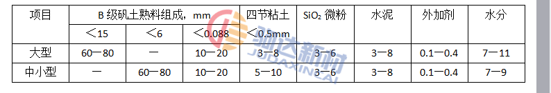 由于低水泥高鋁質耐火澆注料預制塊的尺寸較大,最大尺寸達4m以上,重量1噸以上,需室外露天成型。冬夏溫差達數十度,致使凝結時間有很大的波動。夏季氣溫達30℃以上,凝固快,往往來不及成型,泥料已凝結:而冬季氣溫在0℃左右,3—5d尚不能凝結,占用大批模具。因此,在夏季需加入緩凝劑,在冬季需加入促凝劑,以調整作業時間。根據不同的產品及其工藝要求,初凝時間不早于40min至2h,初凝時間不晚于4—6h。緩凝劑可用糖蜜等,促凝劑可用MS水玻璃速凝劑,用量均在1%—3%。應當指出,有的促、緩凝劑兼有減水作用。