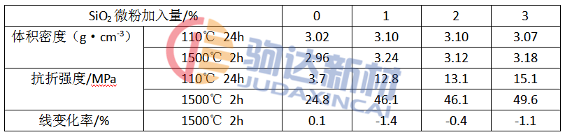 在固定棕剛玉5~1mm占50%(質量分數,下同),1~0mm占15%,純鋁酸鈣水泥占4%,≤0.074mm白剛玉粉和SiO2微粉合量為31%,復合添加劑(氧化鉻和氧化鋯)、減水劑、防爆劑等外加劑適量的條件下,SiO2微粉添加量對澆注料性能的影響如表1所示,可見,隨著SiO2微粉加入量的增加,澆注料的烘干強度隨之增加。綜合考慮1500℃2h燒后的性能,以2%的SiO2微粉添加量為最佳。