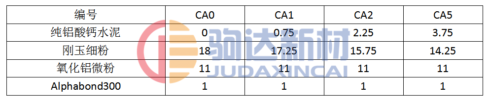 試驗原料為:電熔白剛玉顆粒(w(Al2O3)≥98.9%)及細粉(w(Al2O3)≥99.1%);α—Al2O3微粉(w(Al2O3)≥98.9%,d50=1.8um);Alphabond300(w(Al2O3)≥88%,w(CaO)≤0.1%,d50=6um);純鋁酸鈣水泥(Secar71,w(Al2O3)=69.4%,w(CaO)=29.8%)等。