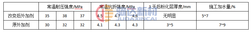 傳統的澆注料外加劑通常采用的是木質素鈣鹽及鈉鹽,使得澆注料的堿金屬含量增加,加速了水化分解的反應,經過調整,試驗了新型的復合減水劑,減少鈣鹽的加入,并在加入量上嚴格控制,通過試驗室驗證后在生產中進行了試驗,改變外加劑的種類,并達到最佳的加入量,坯體表面粉化的現象得到了改善,從3~5天延長到一周左右,同時坯體的強度也有所提高。不同的外加劑對澆注料性能的影響見表2。這樣,再結合干燥時間的控制,盡早干燥,增加早期強度,現在坯體表面粉化已經很少發生了。