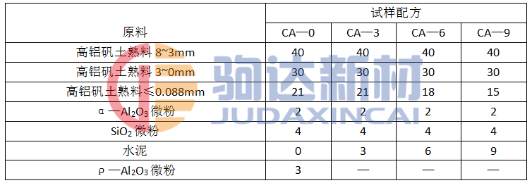 高鋁澆注料所用主要原料有特級礬土熟料、SiO2微粉、α—Al2O3微粉、ρ—Al2O3微粉和純鋁酸鈣水泥,其理化性能指標(biāo)如表1所示。