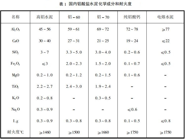 鋁酸鈣是由燒結(jié)法或熔融法生產(chǎn)的鋁酸鈣熟料經(jīng)細(xì)磨而制成的水硬性改凝材料。它具有快硬高強(qiáng)、耐火、抗硫酸鹽侵蝕的特點(diǎn)。國內(nèi)鋁酸鹽水泥的典型化學(xué)成分如表1所示