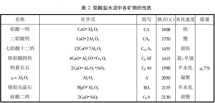 鋁酸鹽水泥的結(jié)合性能主要是由于鋁酸鈣的水化而實(shí)現(xiàn)的。水泥的化學(xué)成分不同,其礦物的成是不同的。在鋁酸鹽水泥中,可能出現(xiàn)的礦物及其耐火性能與水化性能如表2所示