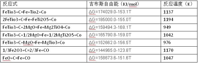 鈦渣是一種高熔點(diǎn)的爐渣。鈦渣熔體具有強(qiáng)腐蝕性、高導(dǎo)電性和黏度變化劇烈的特點(diǎn)。鈦渣 的主要成分是TiO,此外還含有相當(dāng)數(shù)量的低價(jià)鈦氧化物(Ti3O5、Ti2O3、TiO)和鐵氧化物(FeO和Fe2O3),因而具有極高的化學(xué)活性。鈦渣電爐的爐內(nèi)最高溫度可達(dá)2073K,在這樣高的溫度下,它們幾乎能與所有的金屬和非金屬材料發(fā)生化學(xué)反應(yīng)。事實(shí)上,工業(yè)生產(chǎn)時(shí)作為工作層的爐襯無論采用哪一種耐火材料,都會(huì)被鈦渣熔體所腐蝕,嚴(yán)重時(shí)甚至出現(xiàn)爐墻穿孔等生產(chǎn)事故。以常見的鎂質(zhì)或碳質(zhì)耐火材料為爐襯時(shí),熔煉鈦渣時(shí)熔池內(nèi)的熔液與爐襯耐火材料發(fā)生的主要化學(xué)反應(yīng)和標(biāo)準(zhǔn)吉布斯自由能方程式見表1所示。