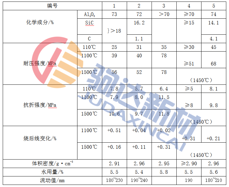 表1-1 出鐵溝用自流耐火澆注料的性能